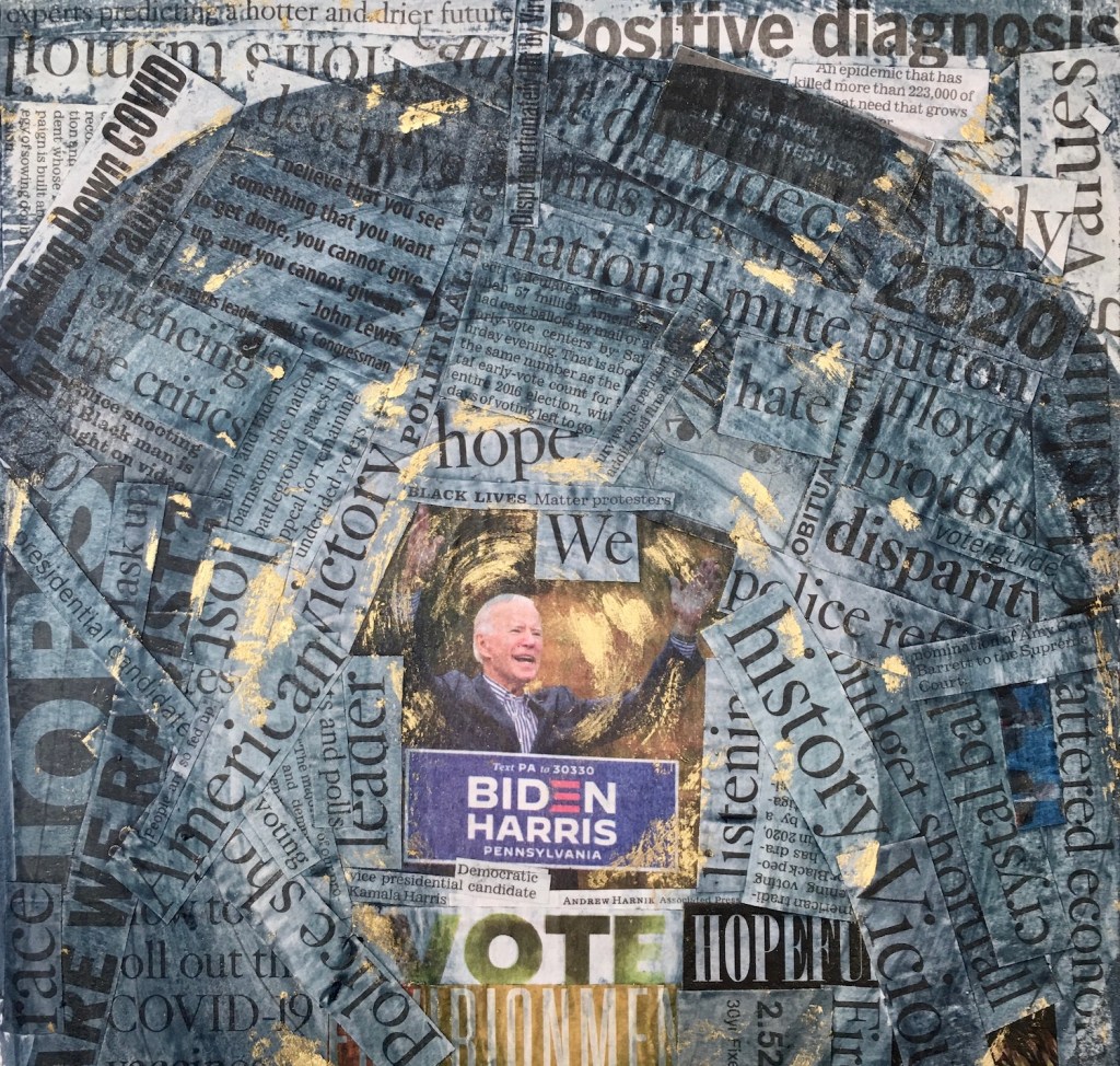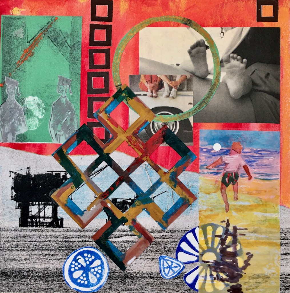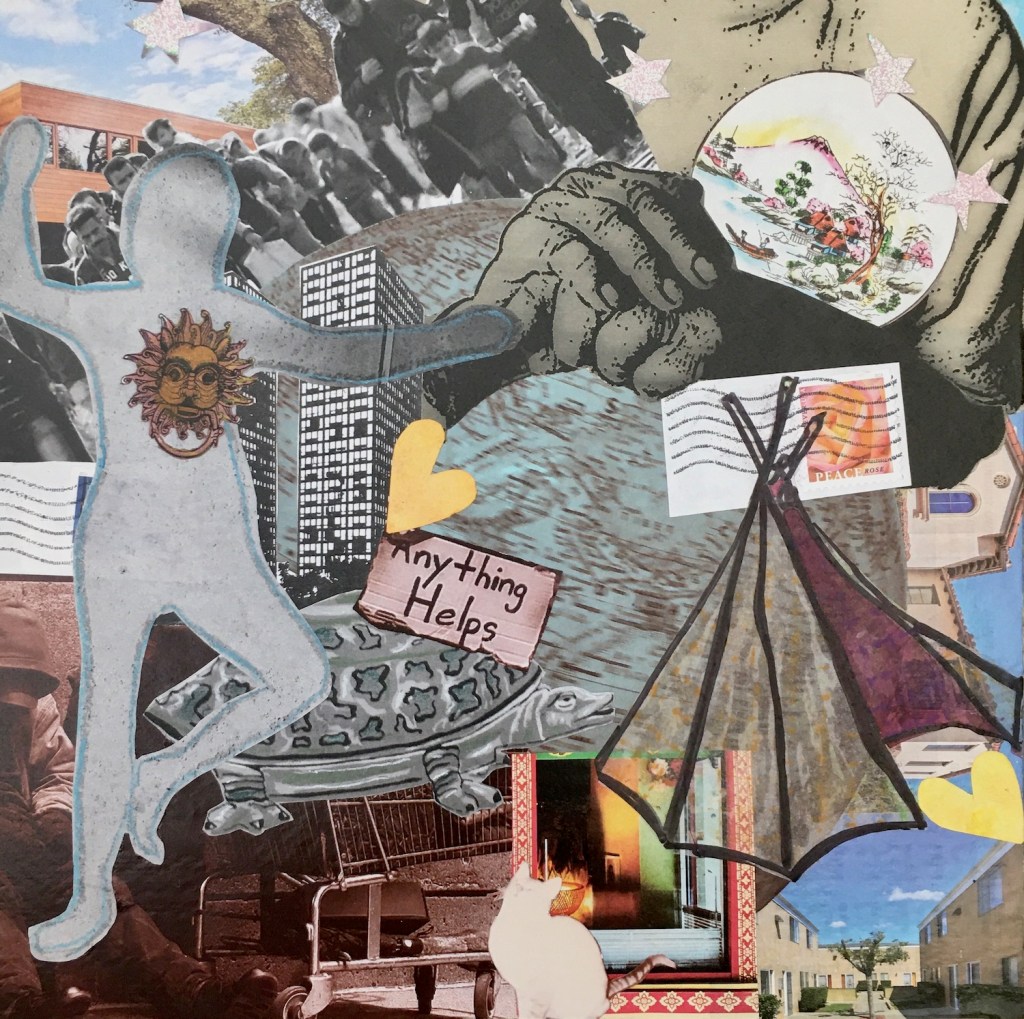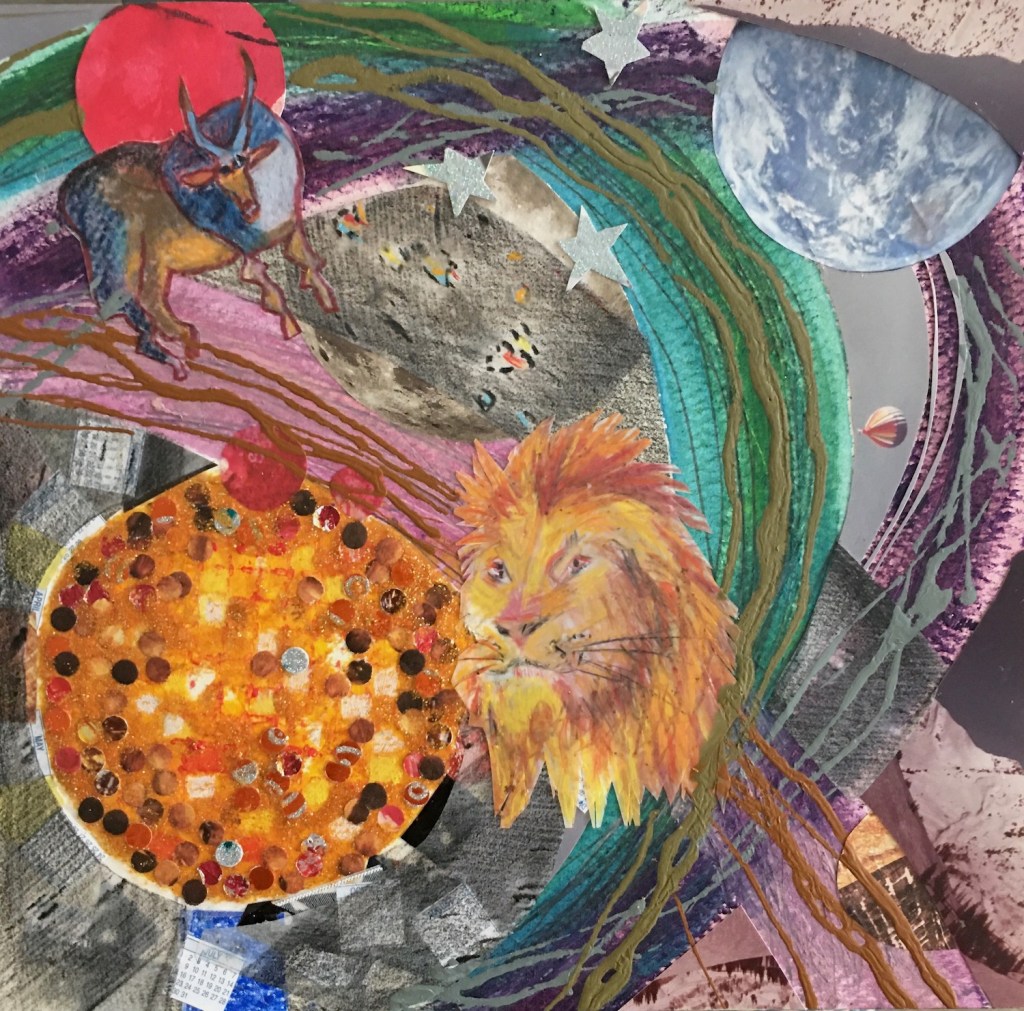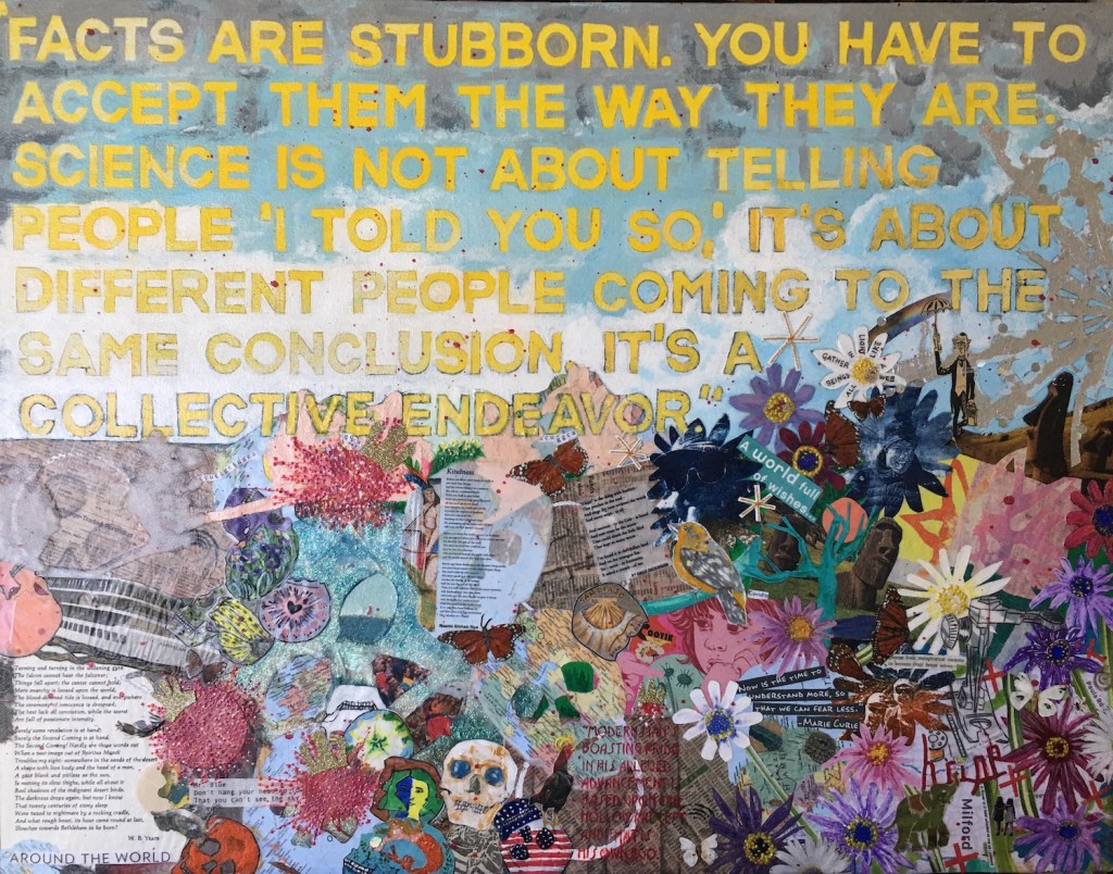 My access to a printing press for printmaking was closed. Inspired by Rauschenberg and Matisse I began to experiment with various mediums and methods: glue, cutting images from magazines, listening to music lyrics and poetry, reading scientific articles, and painting mystery and beauty onto skulls. I made my first mixed media collage for myself- art therapy. I didn’t intend to share it with others. It turns out “others” inspired every effort. Thank you. Thank you for waving hello and for crossing the street and giving space. Thank you for sharing information, inspiration and hope.